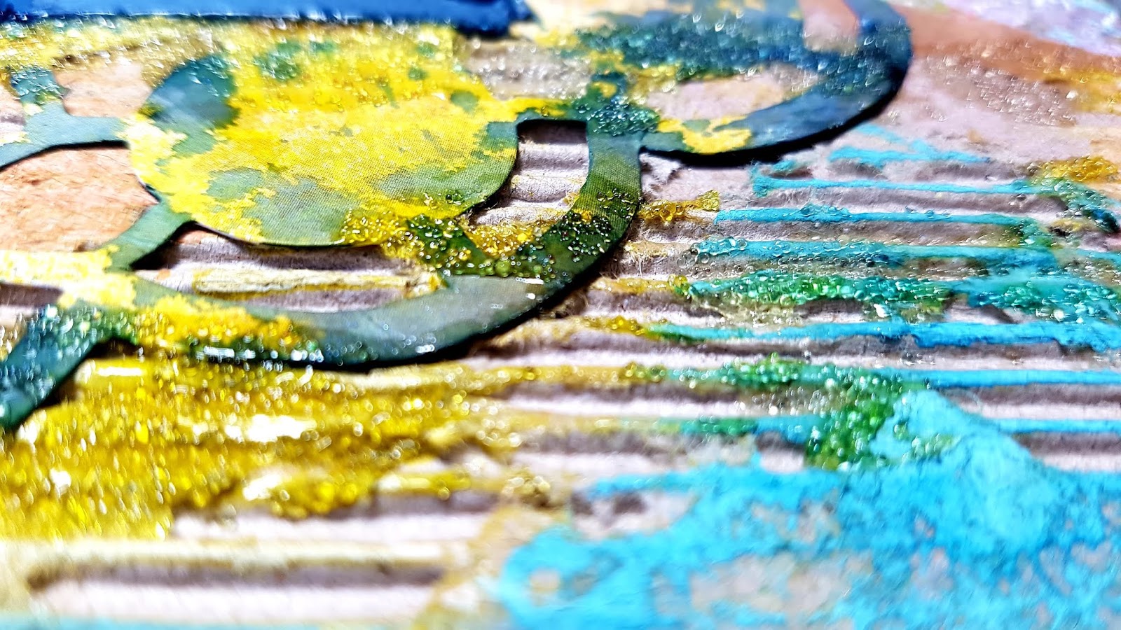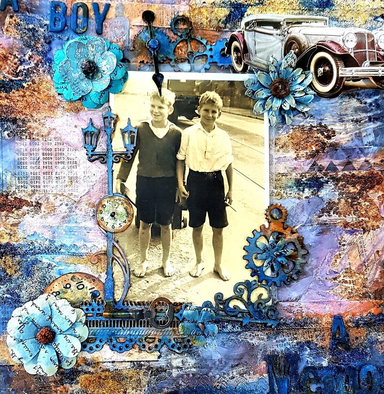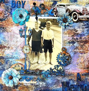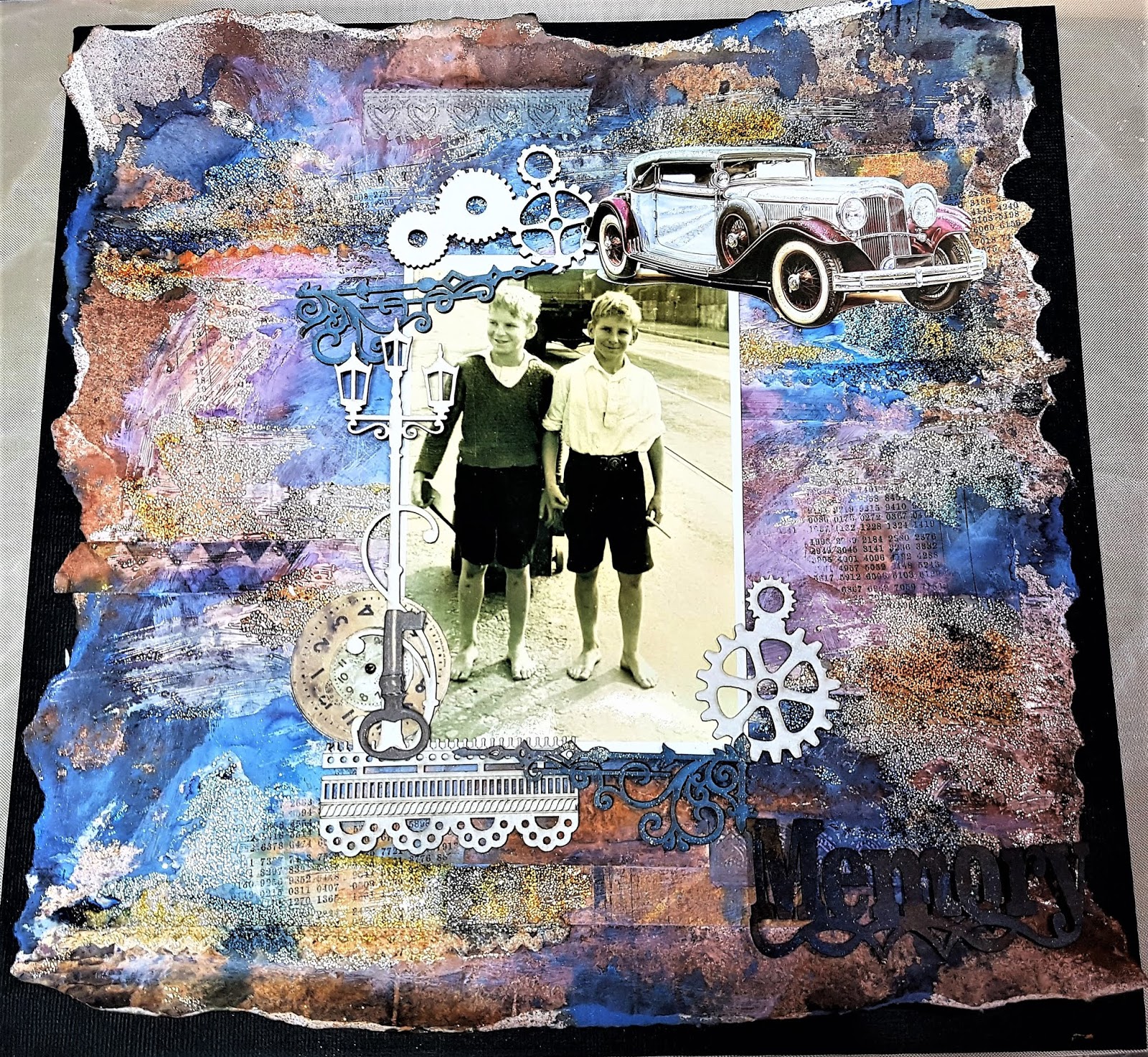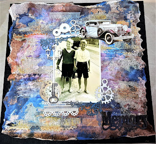 I've completed another page for my Mums memory album. Unfortunately I have very few photos of my Dad's family. The ones I did have I copied and made a page with a large central pocket for the images to go in. At the top of each photo I have added a metal word disk to use as a grip so the photos can be pulled out to be looked at. I again used cheap ink sprays in a blue yellow brown theme plus glass bead gel applied in patches for added texture and to make your eyes roam over the page.