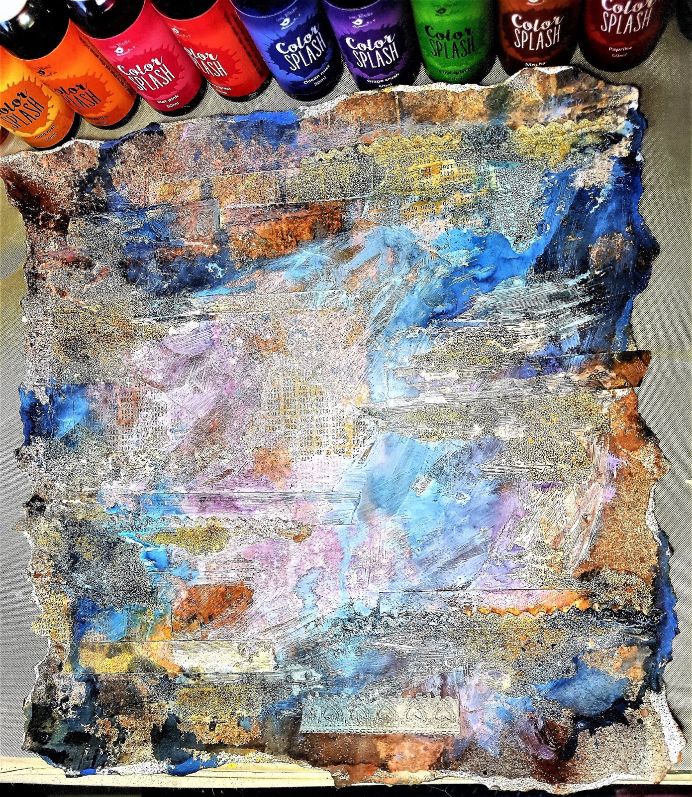 At the bottom I added a torn piece of corrugated card board, the centre and background are scrap book pages plus a large white paper Dollie . The pocket has randomly glued bits of paper, text, washi tape, lace etc and an ink coloured chip board sign. A smaller Dollie was sprayed with inks to give it a rust effect and sits under the sign
